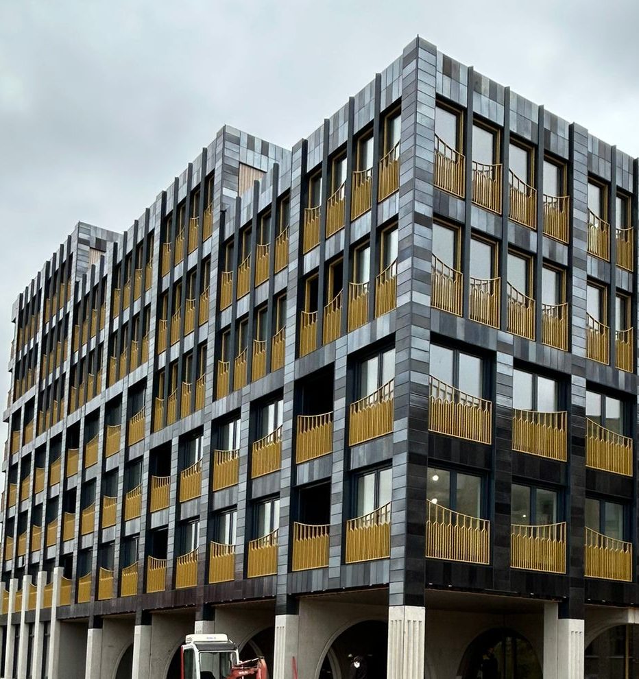 De gevels springen in het oog door de geglazuurde grijsblauwe tegels, die eerder onderdeel waren van het Huis van Delft. In combinatie met de bronskleurige hekwerken en kozijnen is er een bijzonder en krachtig gevelbeeld gerealiseerd dat perfect aansluit op het ontwerp van KOW architecten en RRog stedenbouw en landschap.